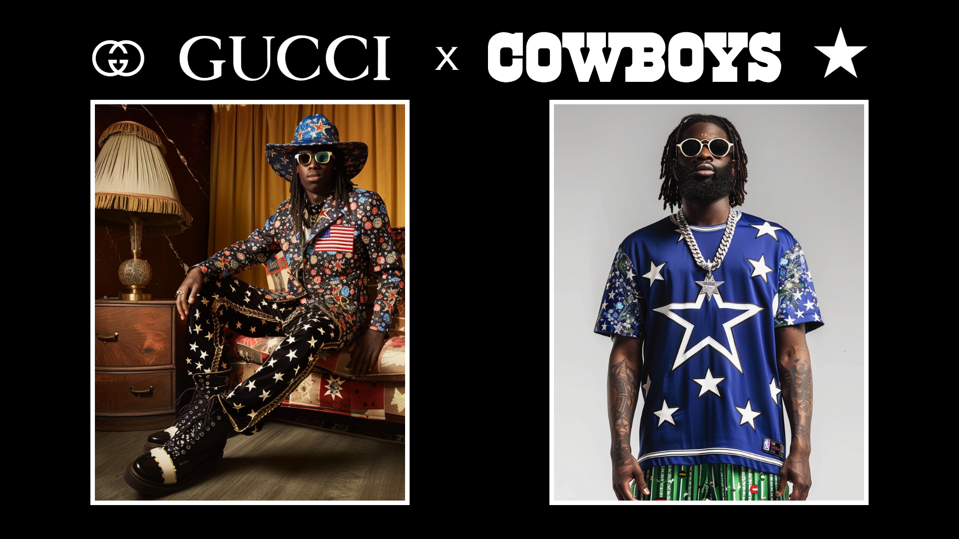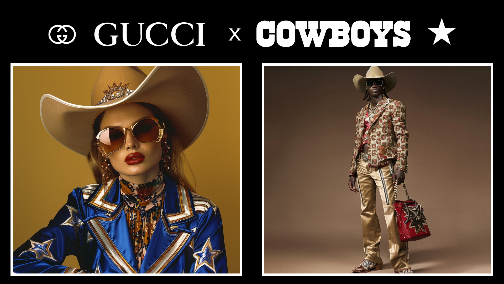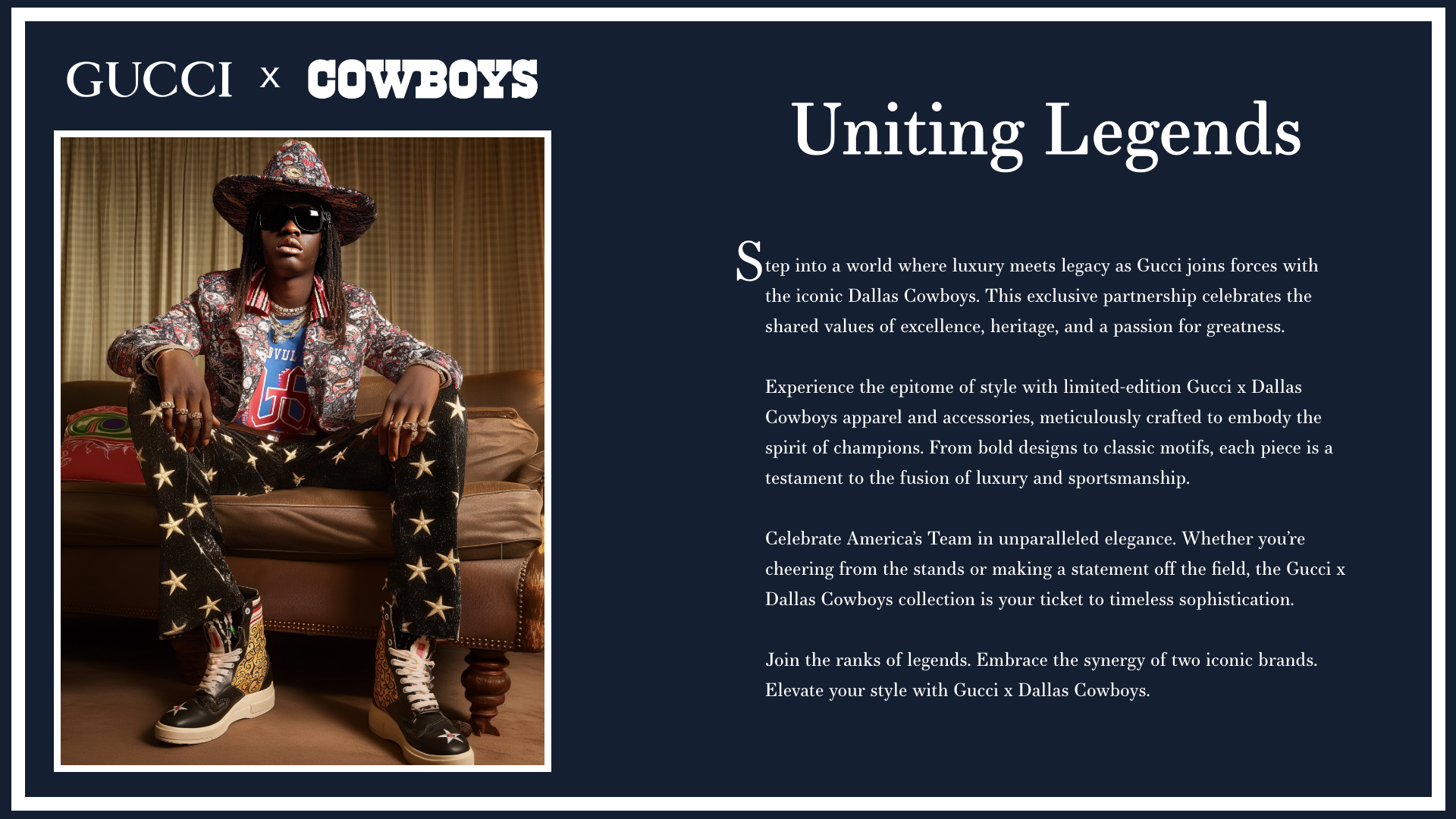 Gucci X Dallas Cowboys mashup, AI-generated content, and copy. Showcasing my skills with AI.