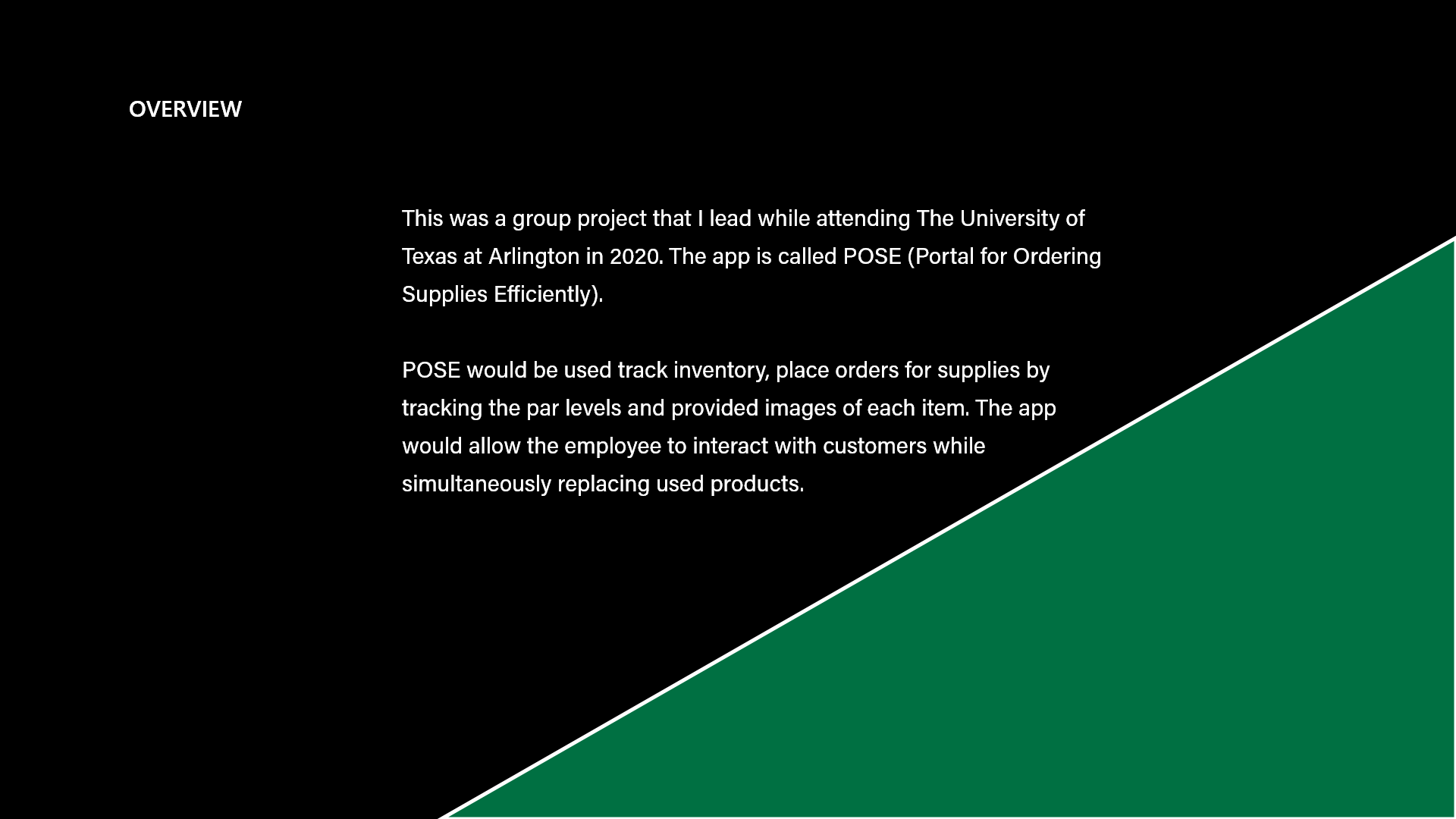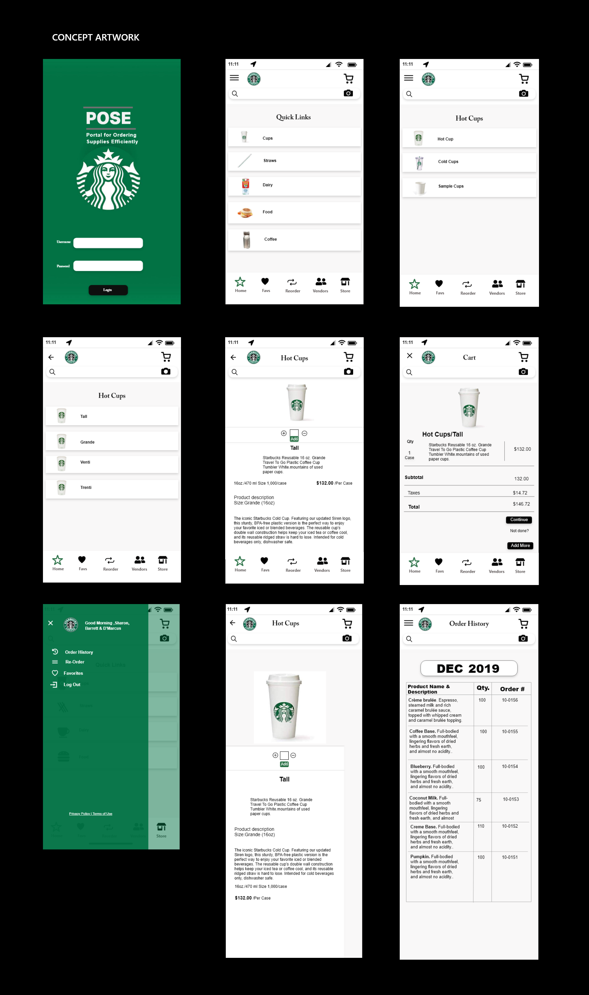 POSE would be used to track product inventory at all Starbucks locations. The application would have the ability to place orders for supplies by tracking the par levels of each item. The app would allow the employee to interact with customers while simultaneously replacing used products.